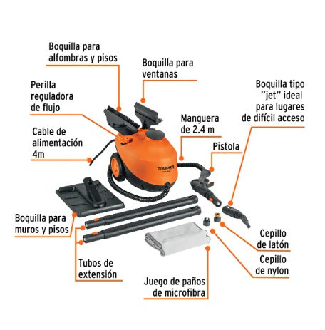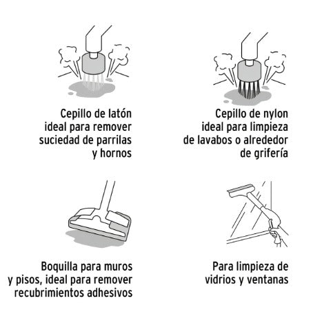 🧰 Kit de Accesorios Completos: Incluye boquillas intercambiables, cepillos de cerdas de nylon y latón, paños de microfibra y extensiones que facilitan el uso en distintas superficies.