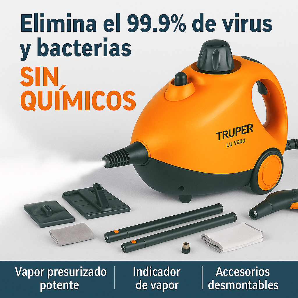 💨 Potencia de 1800 W: Genera vapor a alta presión y temperatura (hasta 100 °C) para eliminar grasa, suciedad y bacterias sin necesidad de productos químicos agresivos.