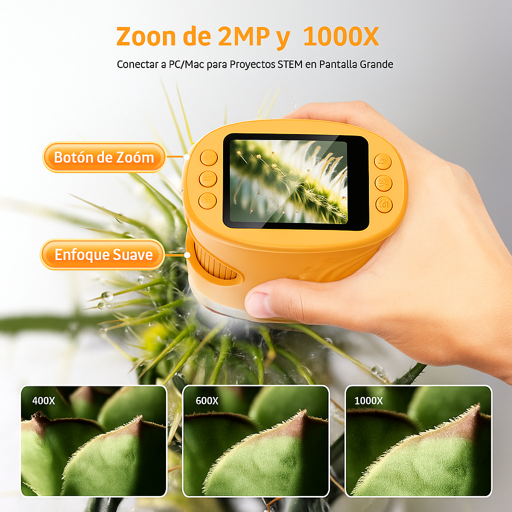 🔬 Zoom hasta 1000×: Permite ampliar objetos diminutos hasta mil veces, lo que facilita la observación de detalles que el ojo humano no distingue.
